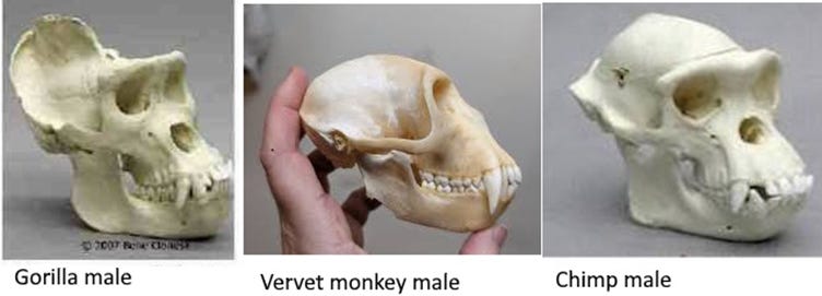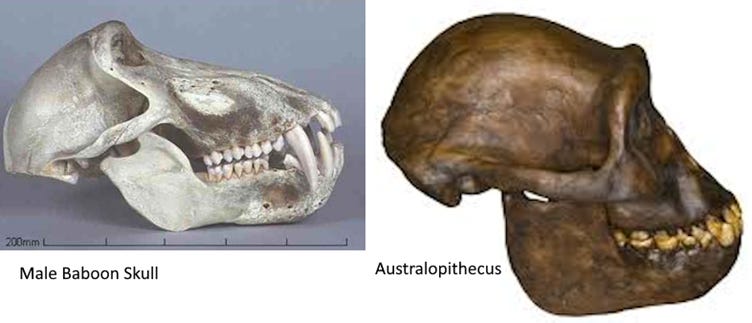 The baboon jaw is that of a plant-eater with a fearsome bite, while the australopithecus jaw, which humans have inherited, is only for eating. And the baboon’s frightening canine presentation to other species is typical of primates, it’s the hominin skull that is out of step. Other animals that get close to monkeys or apes need to know that they bite, and the primates help them to recognize that fact by showing their canines in gestures.