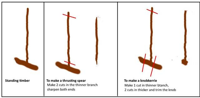 Figure 9 sketches out the activities that would be needed to make a thrusting spear as a “stopper” weapon, and to make the more problematic knobkerrie as a “striker”, used once an attacker had been halted and the initiative taken from it.