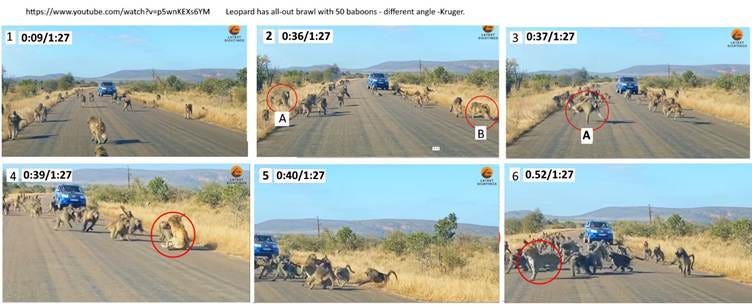 At first the troop is strolling peaceably along the road but at 36 seconds male A has seen that female B, with an infant on her back, is being pursued by a leopard. A second later he is racing to intercept the leopard and at 0:39s the male collides head-on with the leopard, stopping it, while about 6 other males are rushing up in support. At 0:40s a brawl has developed, including on the right, a female who has discarded an infant in the grass. It is worth single-framing through the stages in the brawl that lasts for 12 seconds before the leopard gets up and flees.
